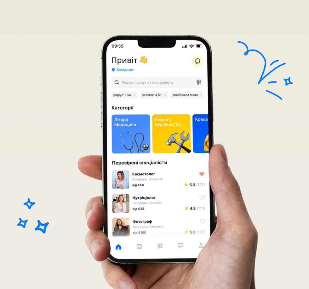 Фільтруйте послуги за локацією, рейтингом та мовою. Лише кілька кліків і ви знайдете потрібного фахівця поруч.